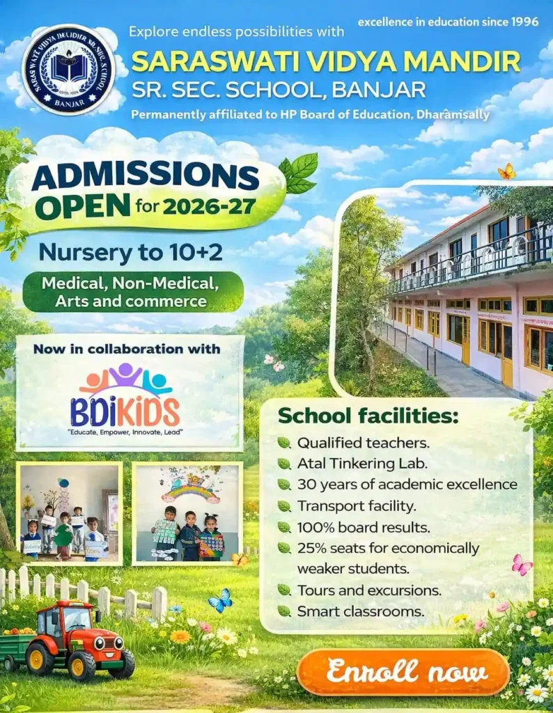 Saraswati Vidya Mandir Sr. Sec. School, located in Banjar, District Kullu. It is a well-respected institution that provides a quality education in a peaceful and natural environment. The school is permanently affiliated with the HP Board of Education, Dharmashala. The school has over 30 years of academic excellence and a strong reputation for nurturing students into confident and responsible individuals.