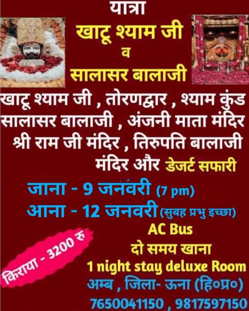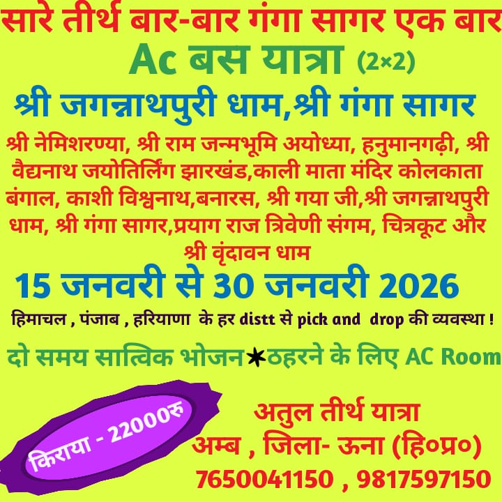 This pilgrimage tour is planned from January 15 to 30, 2026. Atul Teerth Yatra, based in Amb, provides pickup and drop-off facilities from different districts of Himachal, Punjab, and Haryana. During the journey, travelers are provided with pure vegetarian meals twice a day and also a comfortable stay in AC rooms. This yatra package is available at an affordable cost of only INR 22,000. The package cost covers travel arrangements, accommodation, and meals.